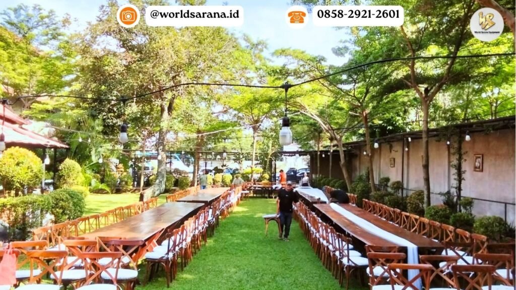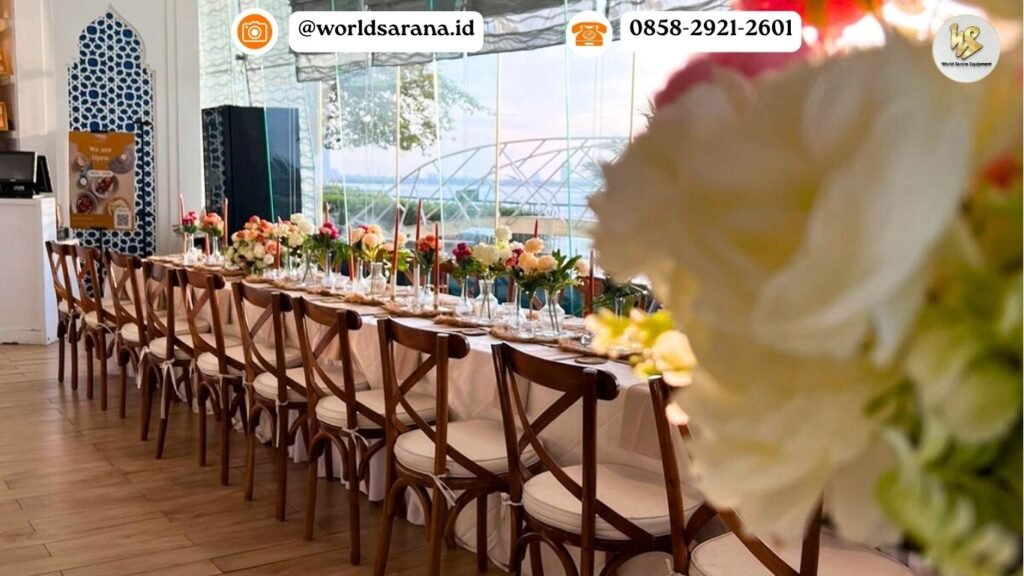 Di dunia acara, detail kecil dapat membuat perbedaan besar. Kursi, contohnya. Banyak orang menganggap kursi sebagai tempat untuk duduk. Meskipun demikian, kursi dapat berfungsi sebagai elemen dekorasi utama yang dapat mengubah suasana seluruh ruangan. Kursi crossback sangat unik. Modelnya sederhana tetapi elegan, dan cocok untuk tema santai, modern, minimalis, atau klasik. Bayangin saja, Anda mengadakan acara di rooftop Setiabudi dengan pemandangan kota Jakarta, dan tamu duduk manis di kursi crossback dengan lampu gantung.